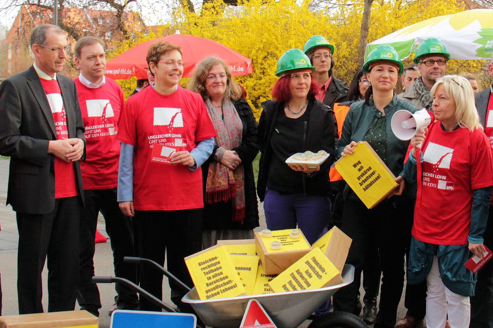 Mit Keksen - ca. ein Fünftel kleiner als gewöhnlich - und leuchtend roten T-Shirts haben Abgeordnete der SPD-Fraktion im Thüringer Landtag für eine gerechte Bezahlung von Frauen und Männern in Thüringen demonstriert. „Es ist leider Realität in Deutschland, dass Frauen bei gleicher Arbeit immer noch deutlich weniger als Männer verdienen. Im bundesweiten Durchschnitt haben sie 22 Prozent weniger auf dem Gehaltszettel als die Männer“, sagte Dorothea Marx, die stellvertretende Vorsitzende der SPD-Fraktion bei der Aktion heute Morgen vor dem Landtag. „Das muss sich ändern, und zwar dringend“, so Marx weiter.