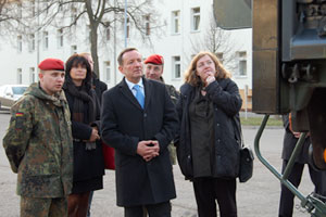 In der Karl-Günther-Kaserne informierte Oberstleutnant Klaus Glaab, Kommandeur des Raketenartilleriebataillons den Minister und seine Begleiter über die Geschichte, die Struktur und die Aufgaben des Standortes. Im Anschluss besichtigte der Minister die ausgestellten Militärfahrzeuge im Kasernenhof (Bild).